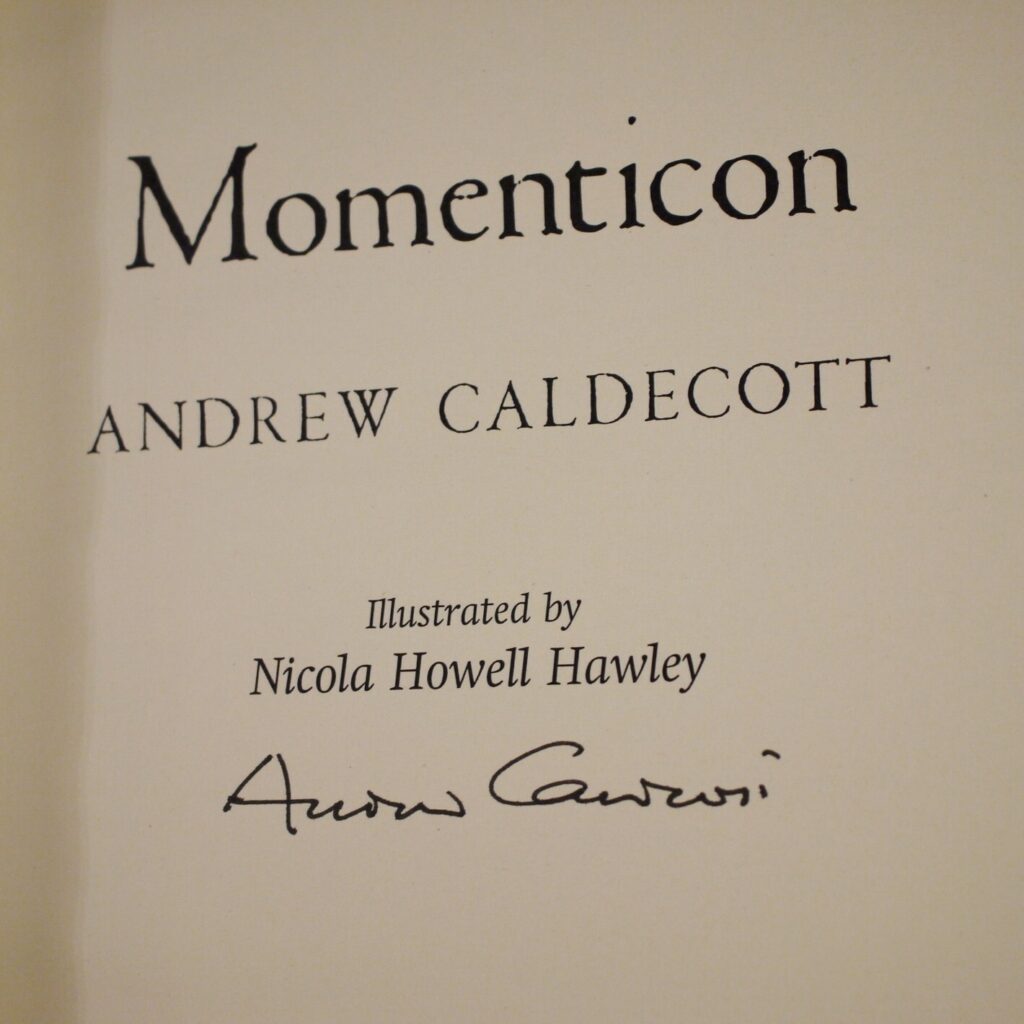 Author: Andrew Caldecott (Signed Copy)Title: MomenticonPublication: First Edition 1st Impression Published By Jo Fletcher Books London 2022………….   (See (Pictures)Condition of the Book and Dust-Jacket:This is a Fine Copy of this Book in a Fine Dust-Jacket with NO faults and has not been read.Signed by Andrew Caldecott on the title page.We have recently acquired a large and wonderful collection of approx 1000 Signed Modern Firsts,all in ‘As New’ Condition and unread,with many Signed and Dated and there are many Signed Limited Editions also.They include Crime Fiction,Fantasy,Science Fiction,Horror and Historical Fiction.It’s a comprehensive list so please feel free to inquire for details.This is a superb copy for the collector with crisp white page edges.Fantasy Novel 8vo 362pp First UK Edition 1st Impression [2022]        Sent Free Within The UK…Overseas Postage Air-Mail .All Orders Shipped in a Box and Sent With Tracking                                                        We are PBFA Members and Adhere to Their Rules