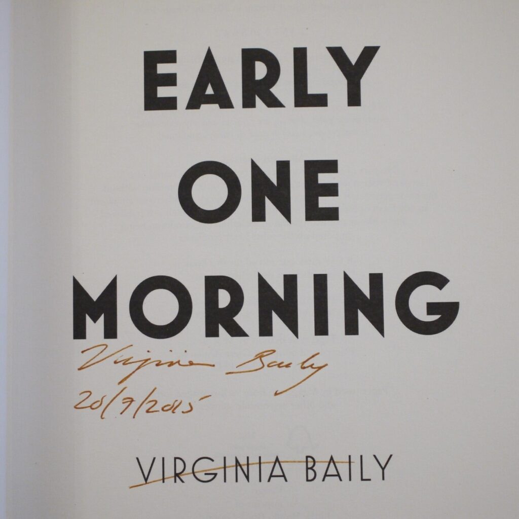 Author: Virginia Baily (Signed Copy)Title: Early One Morning Publication: First Edition (Limited Edition) Published By Virago Press London 2015………….   (See (Pictures)Condition of the Book and Dust-Jacket:This is a Fine Copy of this Book in hardcover in a Fine Dust-Jacket..No faults and has not been read so (As New) and as good as it gets in terms of condition.Signed by Virginia Baily on the Limitations Page.This is copy number 53 of 500 Signed Editions.With Black Sprayed Edges.We have recently acquired a large and wonderful collection of approx 1000 Signed Modern Firsts,all in ‘As New’ Condition and unread,with many Signed and Dated and there are many Signed Limited Editions also.They include Crime Fiction,Fantasy,Science Fiction,Horror and Historical Fiction.This is a superb copy for the collector with crisp white page edges and the dust-Jacket is well protected in a cover sleeve.8vo 391pp First Limited Edition [2015]        Sent Free Within The UK…Overseas Postage Air-Mail .All Orders Shipped in a Box and Sent With Tracking                                                        We are PBFA Members and Adhere to Their Rules