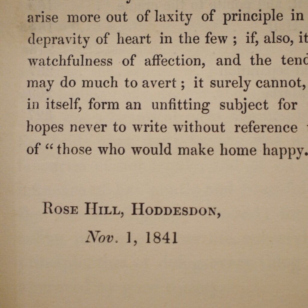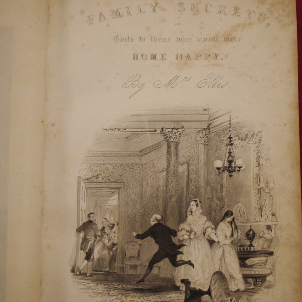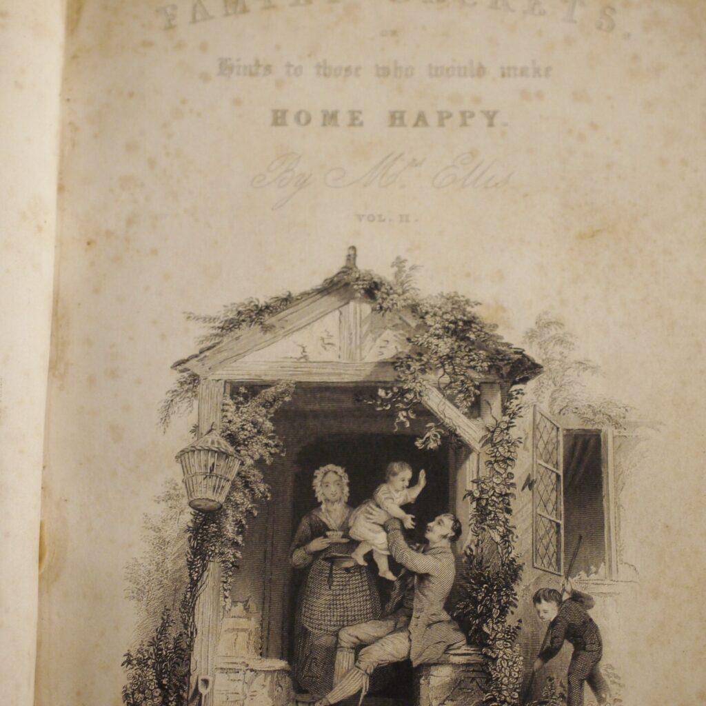 Author: Mrs Ellis (Sarah Stickney)Title: Family Secrets Or Hints To Those Who Would Make Home HappyPublication:  Published By Fisher & Son Newgate Street London 1841………..   (See (Pictures)Condition and Status of the Books:Full Brown Leather Tree Calf Style Bindings.Two Books with Volumes 1 &3 bound in Volume Numbered 1 and Volume 2 bound in Volume numbered 2 along with what appears to be a further fourth volume beginning with Chap 1 ‘The Young Sculpter’ though mention or title page of this fourth volume,all a little intriguing.Gilt leaf tooling to spine compartments and with gilt lined borders to both volumes to front and back.Marbled endpapers.Both front endpapers on each volume have been partially cut (no doubt to remove former owner’s names) though date of July 24th 1844′ is still present.Preface to volume 1 is dated 1841 and publisher’s address is still that of Newgate Street London.Engraved frontispieces and title pages with further engraved plates to each volume.Bindings remain firm with no hinge weakness,some scattered foxing mostly to pre-lims and to rear of the engraved plates themselves.Sarah Stickney (Ellis) was an English Author and a Quaker turned Congregationalist. Her numerous books are mostly about women’s roles in society and she fervently believed that women had a religious duty as daughters, wives and mothers to provide an influence for good that would improve society.Vol 1 328pp,Vol III 190,Vol II 191-312 and Possible Vol IV ? 308pp        Free Sent Within The UK…Overseas Postage All Order Shipped in a Box and With Tracking                                                        We are PBFA Members and Adhere to Their Rules