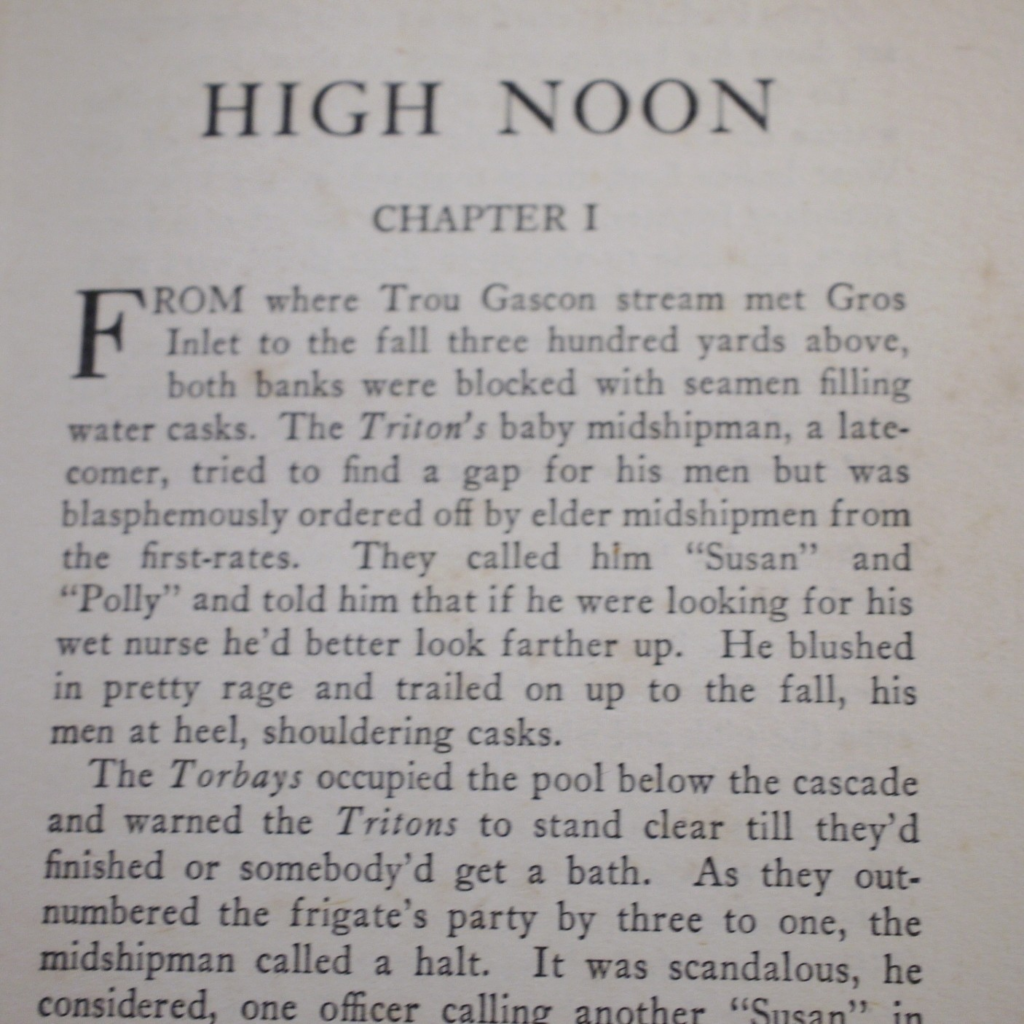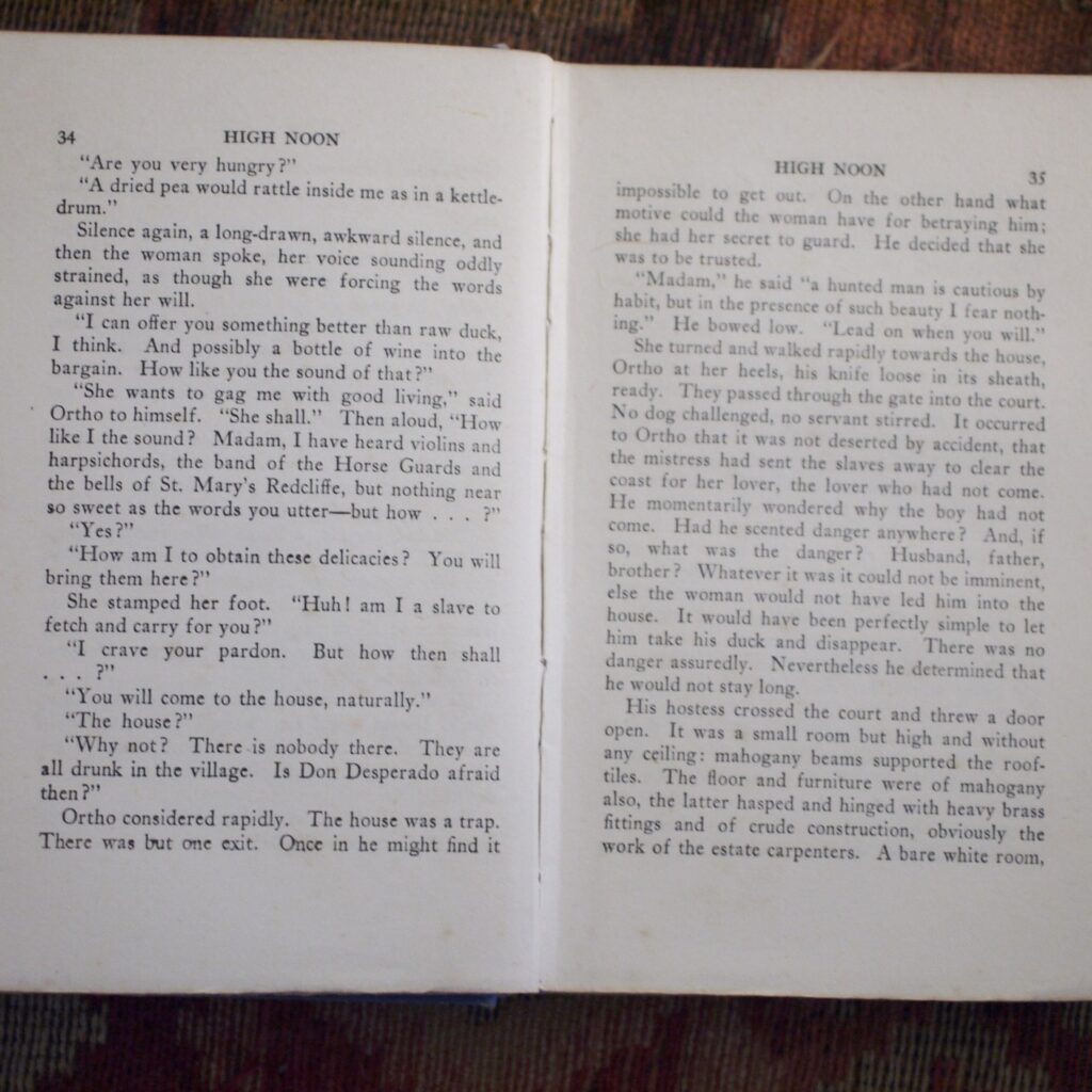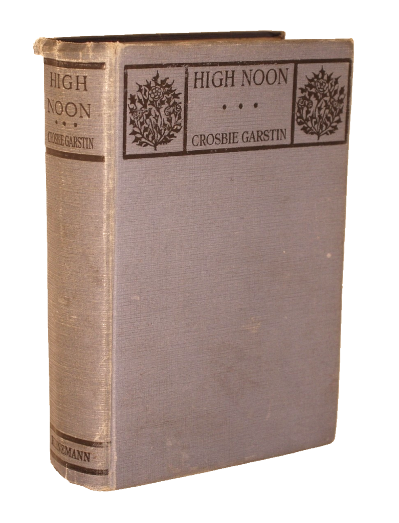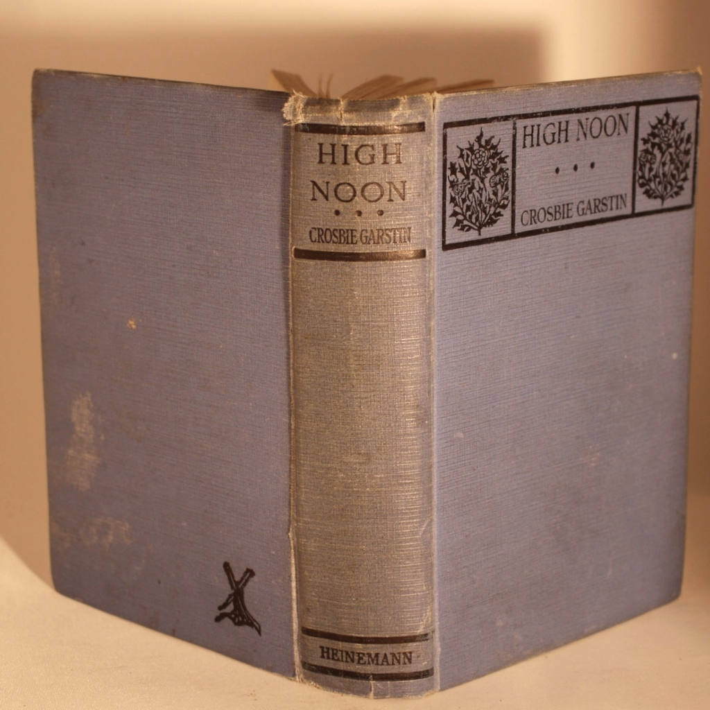 Author: Crosbie Garstin (Signed Copy)Title: High Noon Publication: First UK Edition 1st Impression Published By William Heinemann London 1925……..(See (Pictures)Condition and Status of the Book:This is a Good Copy of this hardcover book in Publisher’s blue cloth with black title lettering to spine and upper cover.There area couple of nicks to the cloth at head and of spine and rubbed also to the tail of spine.This copy has two handwritten letters tipped in at the front of the book by the Author both addressed to a Mr Matheson and one is dated 1923 and the other is 1925 from his Cornwall address.One letter is in reply to the Author’s work and the other one is a cordial supper invitation from Mr Matheson to the Author.Rather charmingly Garstin has replied in part” Don’t worry about the supper,our tastes are very simple,a bone on the door mat will do us admirably” both letters have been signed by Crosbie Garstin.Binding of the book remains firm with a little light spotting to the endpapers,a tad of age toning to the text block edges etc.The novel is the second in the Penhale Series.Ortho Penhale taken by press gang into the Navy, is fighting against the French at the Battle of the Saintes under Admiral Rodney. Returning home wounded to Bosula, his farm in west Cornwall, Penhale finds his world changed irrevocably.High Noon follows the continuing adventures of Ortho Penhale as he finds love and embarks on a disastrous career as a slave ship captain.Rare title especially with the added attraction of the two accompanying letters Tipped in at the front of the book,8vo 331pp First Edition 1st Impression [1925]  Free Sent Within The UK…Overseas Orders are Shipped in a Box and sent with Tracking                                                        We are PBFA Members and Adhere to Their Rules