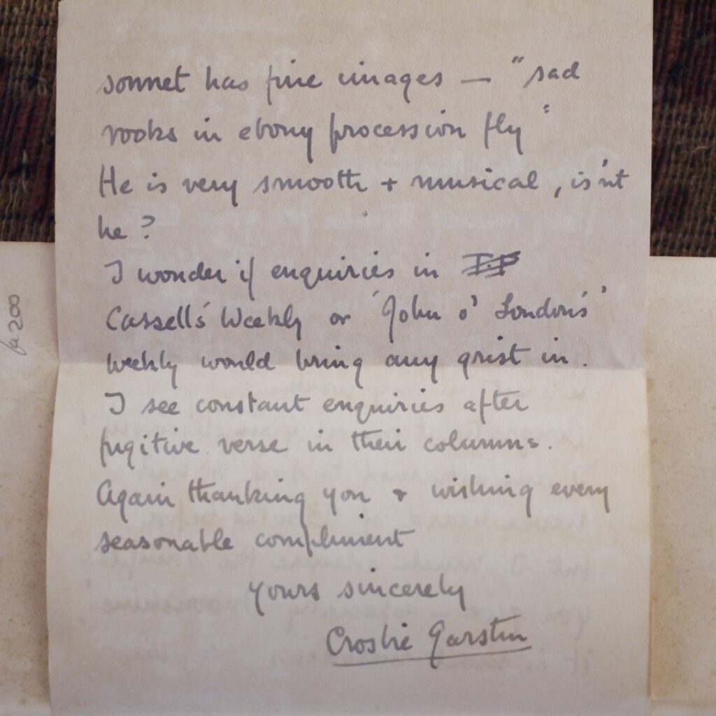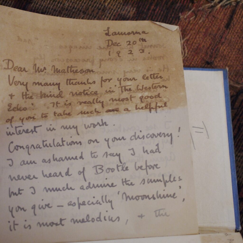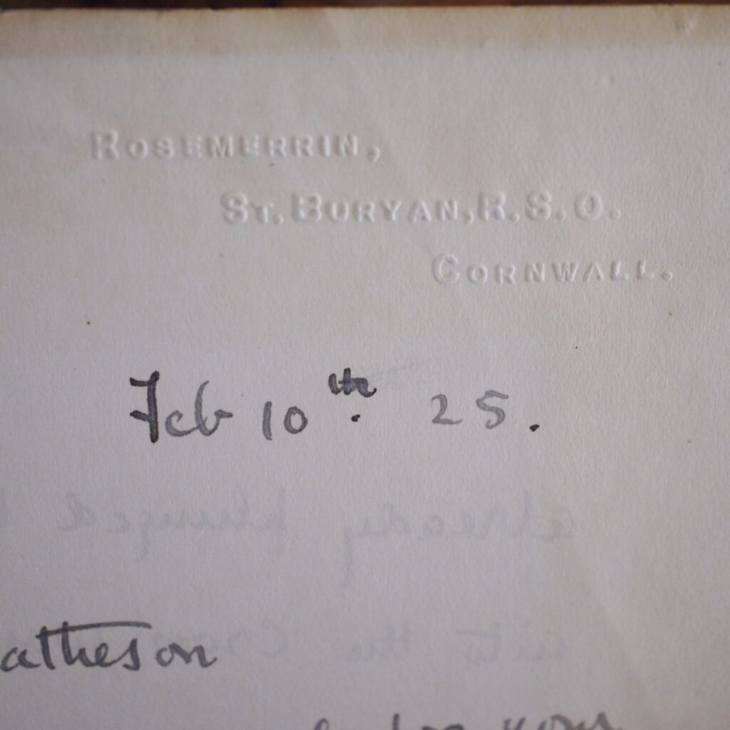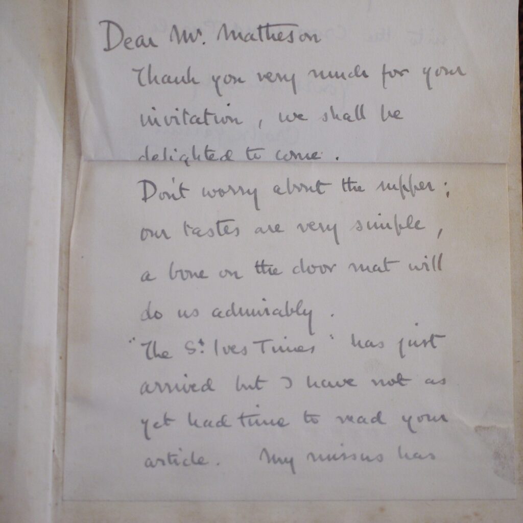 Author: Crosbie Garstin (Signed Copy)Title: High Noon Publication: First UK Edition 1st Impression Published By William Heinemann London 1925……..(See (Pictures)Condition and Status of the Book:This is a Good Copy of this hardcover book in Publisher’s blue cloth with black title lettering to spine and upper cover.There area couple of nicks to the cloth at head and of spine and rubbed also to the tail of spine.This copy has two handwritten letters tipped in at the front of the book by the Author both addressed to a Mr Matheson and one is dated 1923 and the other is 1925 from his Cornwall address.One letter is in reply to the Author’s work and the other one is a cordial supper invitation from Mr Matheson to the Author.Rather charmingly Garstin has replied in part” Don’t worry about the supper,our tastes are very simple,a bone on the door mat will do us admirably” both letters have been signed by Crosbie Garstin.Binding of the book remains firm with a little light spotting to the endpapers,a tad of age toning to the text block edges etc.The novel is the second in the Penhale Series.Ortho Penhale taken by press gang into the Navy, is fighting against the French at the Battle of the Saintes under Admiral Rodney. Returning home wounded to Bosula, his farm in west Cornwall, Penhale finds his world changed irrevocably.High Noon follows the continuing adventures of Ortho Penhale as he finds love and embarks on a disastrous career as a slave ship captain.Rare title especially with the added attraction of the two accompanying letters Tipped in at the front of the book,8vo 331pp First Edition 1st Impression [1925]  Free Sent Within The UK…Overseas Orders are Shipped in a Box and sent with Tracking                                                        We are PBFA Members and Adhere to Their Rules
