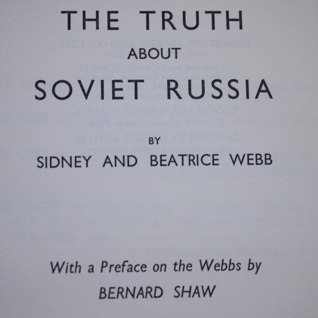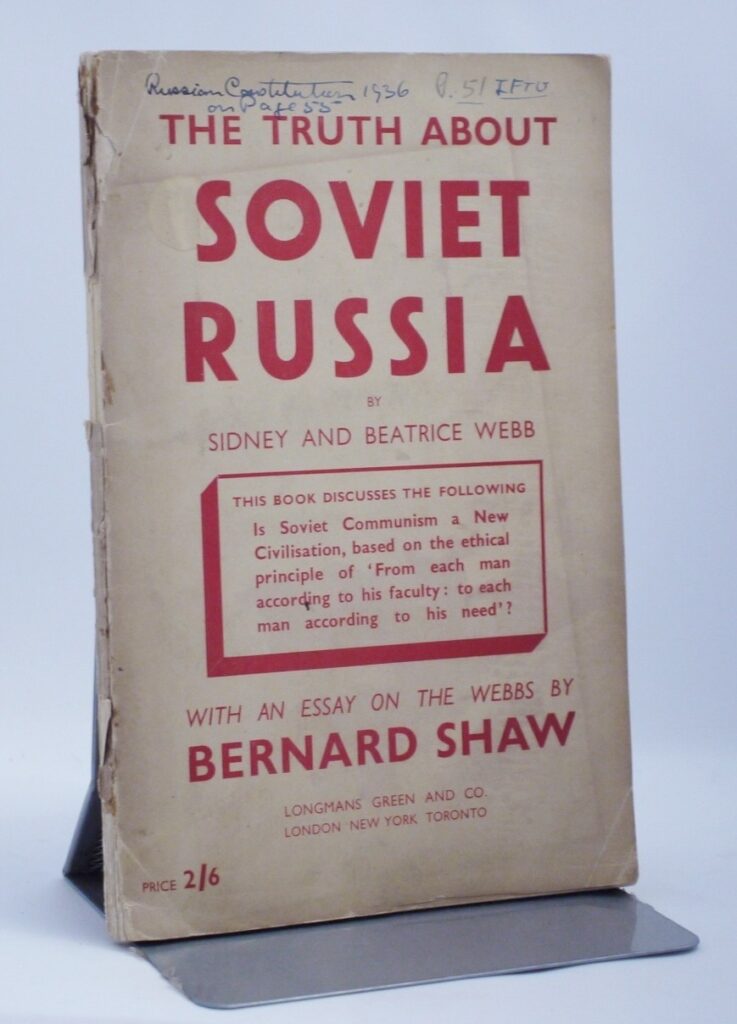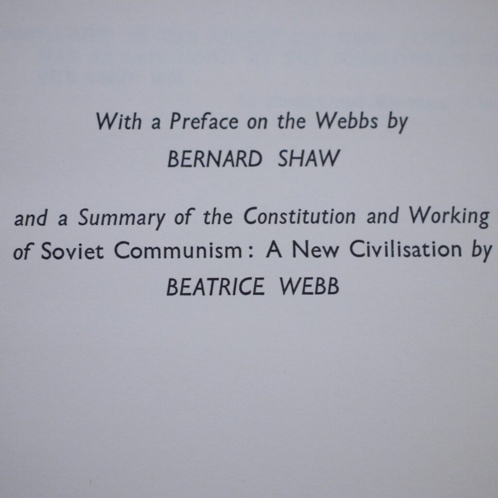 Author: Sidney & Beatrice Webb (Signed Copy) Title: The Truth About Soviet Russia With An Essay on the Webbs by Bernard ShawPublication: First UK Edition 1st Impression Published By Longmans,Green And Co London 1942……(See (Pictures)Condition and Status of the Book:Rare Signed title by Beatrice Webb to Sir Walter Citrine Of Wembley. This is a Good Copy of this book in Publisher’s Soft Cover Wraps with red title lettering to the front cover.The book includes a preface on the Webbs by Bernard Shaw and there is also a summary of the constitution and working of Soviet Communism: A new civilisation by Beatrice Webb.Signed and Inscribed by Beatrice Webb on the front endpaper to Sir Walter McLennan Baron Citrine of Wembley and the book bears his bookplate to the front pastedown.Contents remain clean internally.There is some rubbing and wear to the edges of the book and with some fraying and light chipping to this fragile spine.Front Cover a little loose but holding.There is one former owner’s note in blue ink to the top edge of the front cover..Rare signed title by Beatrice Webb who an English sociologist, economist, feminist and social reformer.She among others founded The London School of Economics and played a crucial role in forming the Fabian Society.Walter McCLennan Baron Citrine was one of the leading British and international trade unionists of the twentieth century and a notable public figure.8vo 79pp First Edition [1942]  Free Sent Within The UK…Overseas Orders are Shipped in a Box and sent with Tracking                                                        We are PBFA Members and Adhere to Their Rules