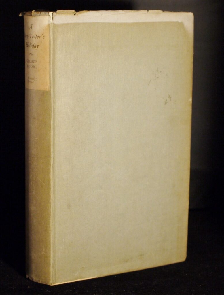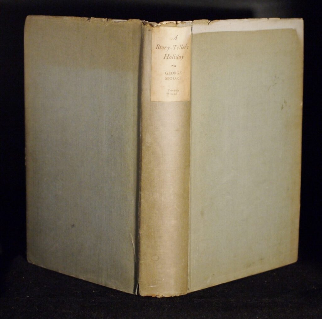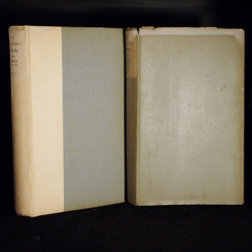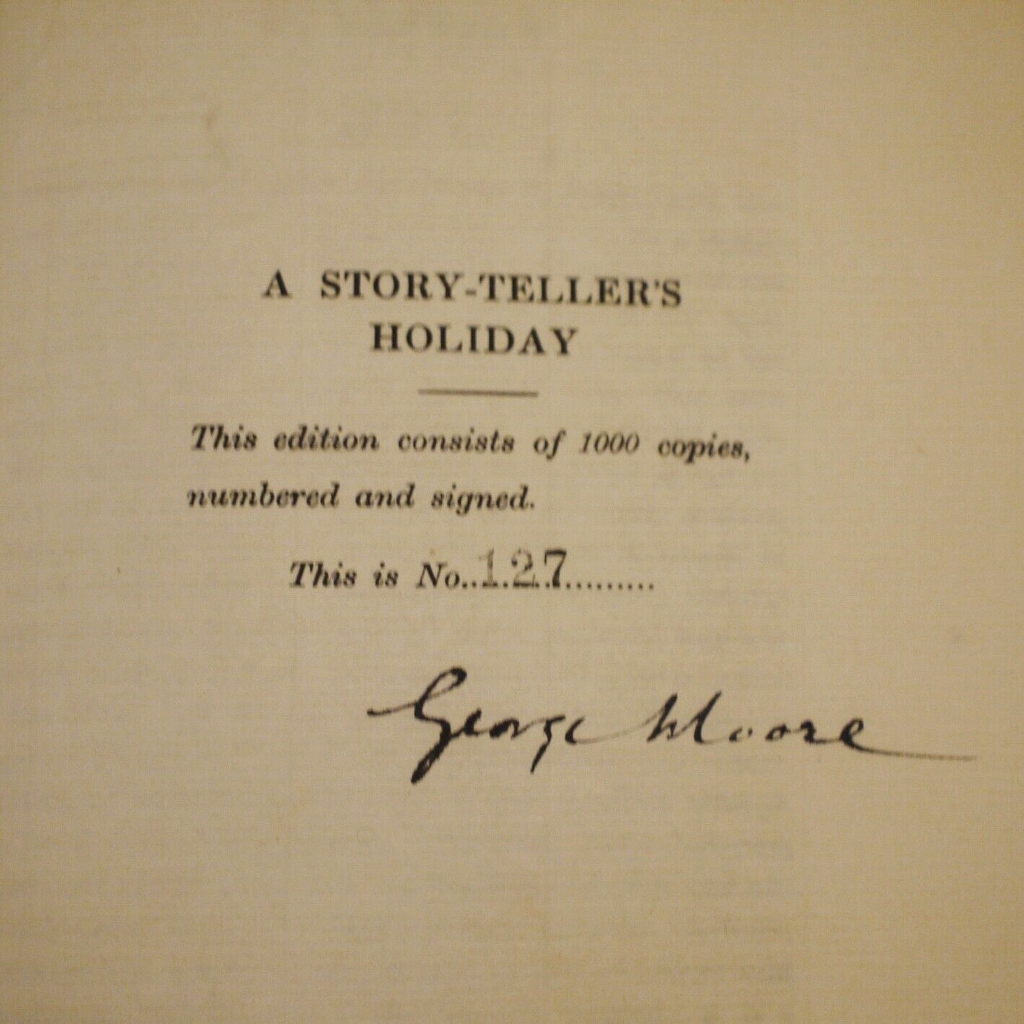 Author: George Moore (Signed Ltd Ed)Title: A Story-Teller’s HolidayPublication:  Privately Printed For Subscribers Only By Cumann Sean-Eolais………. (See (Pictures)Condition and Status of the Book and Dust-Jacket:This is a Very Good + Copy of this Book in light blue and cream coloured cloth boards with paper title label to spine in a Very Good Dust-Jacket that has some edgewear with small nicks to the head of spine and with a closed tear to the bottom edge of the lower cover,also a little uneven fading showing along the top edge of the wrapper on it’s front cover.This is a signed numbered limited edition,one of only 1000 copies with this being number 127 and signed by George Moore on the Limitations Page.With rough cut page edges as issued.Book has a firm binding with no hinge weakness,and there are no former owner’s names present.Very decent copy for the collector,8vo 355pp Limited Edition SIGNED [1918] For Subscriber’s Only    Free Sent Within The UK…Overseas Postage All Order Shipped in a Box and With Tracking                                                 We are PBFA Members and Adhere to Their Rules
