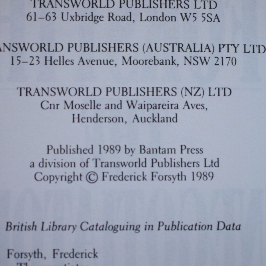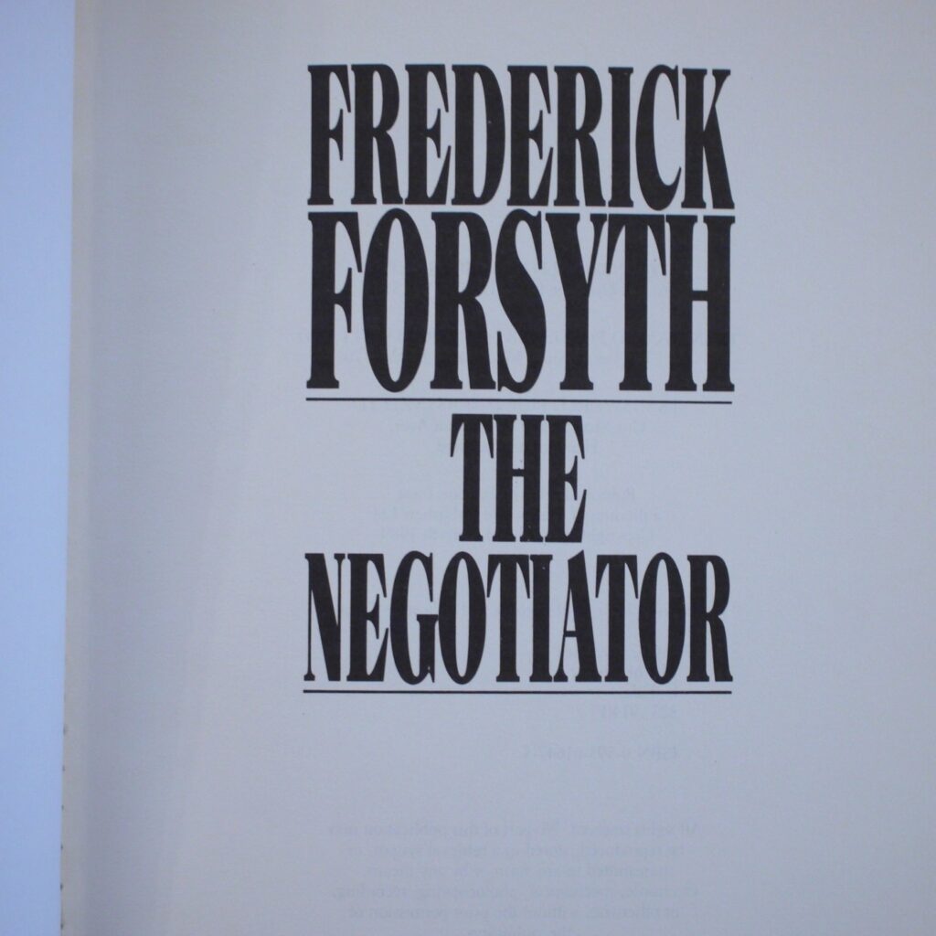 Author: Frederick Forsyth (Signed Copy)Title: The Negotiator Publication: First UK Edition 1st Impression Published By Bantam Press London 1989………(See (Pictures)Condition and Status of the Book and Dust-Jacket:This is a Near Fine Copy of this hardcover book in a Fine Dust-Jacket.Not price clipped with NO chips or tears to the outer edges of the wrapper.This book has been SIGNED without dedication by the Author on a bookplate to the front endpaper.Lovely clean unfaded dust-wrapper.There are NO other names present and the book just has a little spotting or age related dustiness along the top edge of the book.The dust-jacket comes well protected in a removable cover sleeve.8vo 391pp First UK Edition 1st Impression [1989] Free Sent Within The UK…Overseas Orders are Shipped in a Box and sent with Tracking                                                        We are PBFA Members and Adhere to Their Rules