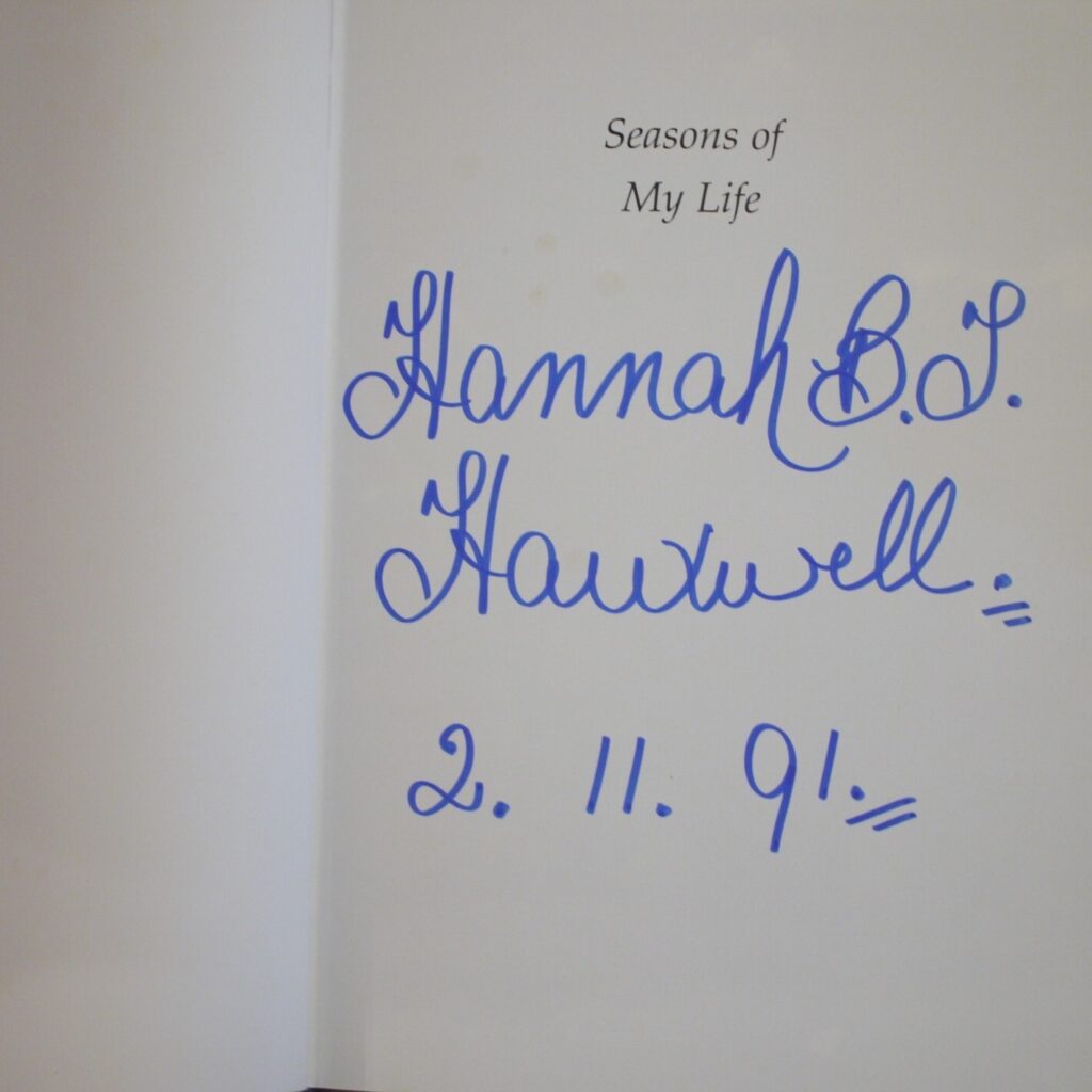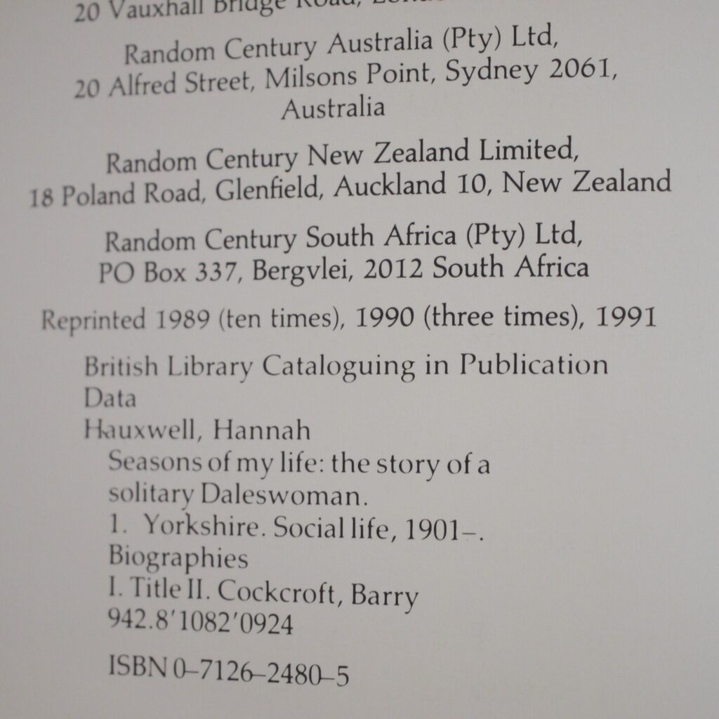 Author: Hannah Hauxwell (Signed Copy)Title: Seasons Of My Life The Story of a Solitary DaleswomanPublication: Reprint Published By Century London 1991…..   (See (Pictures)Condition of the Book and Dust-JacketThis is a Fine Copy of this hardcover book in grey cloth with red title lettering to spine,in a Fine Dust-Jacket which has no chips or tears to the outer edges of the dust-jacket.Not price clipped.This copy has been SIGNED by Hannah Hauxwell in bold blue pen to the Half Title Page.The book has a firm binding with no hinge weakness and it remains lovely and clean internally.Well illustrated.Uncommon Signed Copy,8vo 165pp Reprint [1991]  Hannah Hauxwell: Hauxwell was living alone at Low Birk Hatt Farm in an isolated area of the North Riding of Yorkshire when she came to public attention, first in a Yorkshire Post article published on 6 April 1970 entitled “How to be happy on £170 a year” and then, in 1973, in an ITV documentary, Too Long a Winter, made by produced by Barry Cockcroft, which chronicled the almost unendurable conditions of farmers in the High Pennines in winter.       Sent Free Within The UK…Overseas Postage Air-Mail .All Orders Shipped in a Box and Sent With Tracking                                                        We are PBFA Members and Adhere to Their Rules